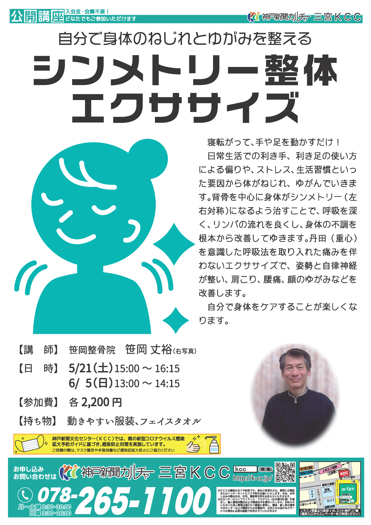 三ノ宮にある神戸新聞文化センターで、体の歪みと捻れを自分で改善する講座を開くことになりました。